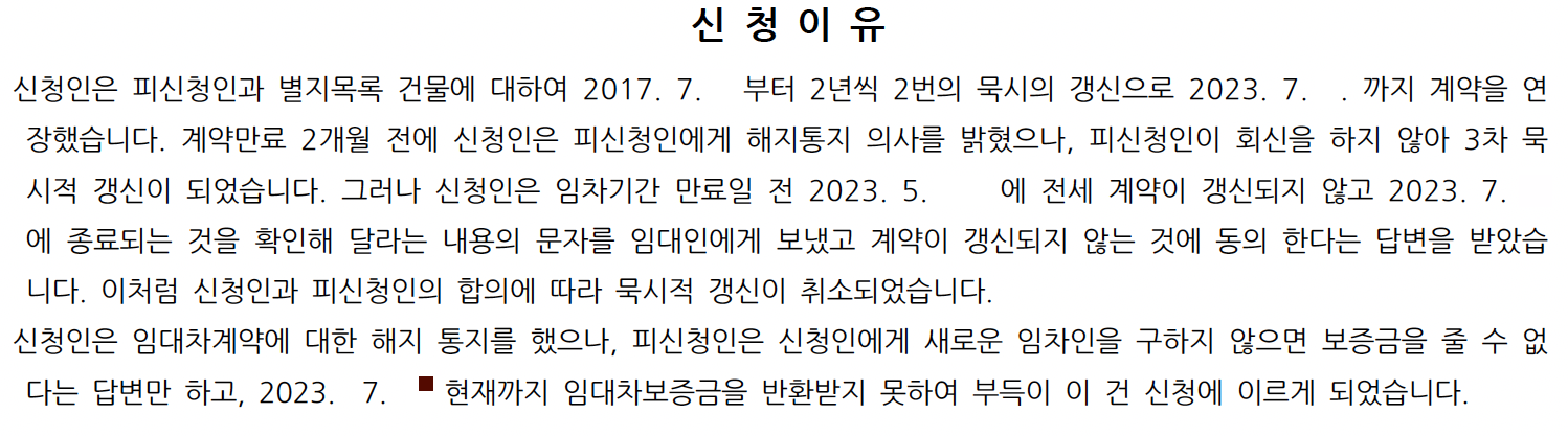 하지만 묵시적 갱신을 취소한다는 내용의 문자(계약 해지 문자 또는 합의서)를 보냈고 답변을 받았고 계약만료일에 보증금을 반환받아야 했으나 반환 받지 못해서 신청하게 되었다." 라는 내용으로 작성을 했다.