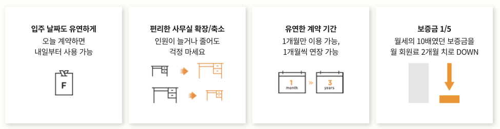 특히, 소규모로 사업하시는 분들이 가장 크게 부담을 느끼는 임대료,관리비 등의 고정비용이 아주 합리적이고, 입주 시 받을 수 있는 혜택 (법률/세무/회계/IT/소프트웨어/마케팅 등) 도 다양하게 준비되어 있습니다.